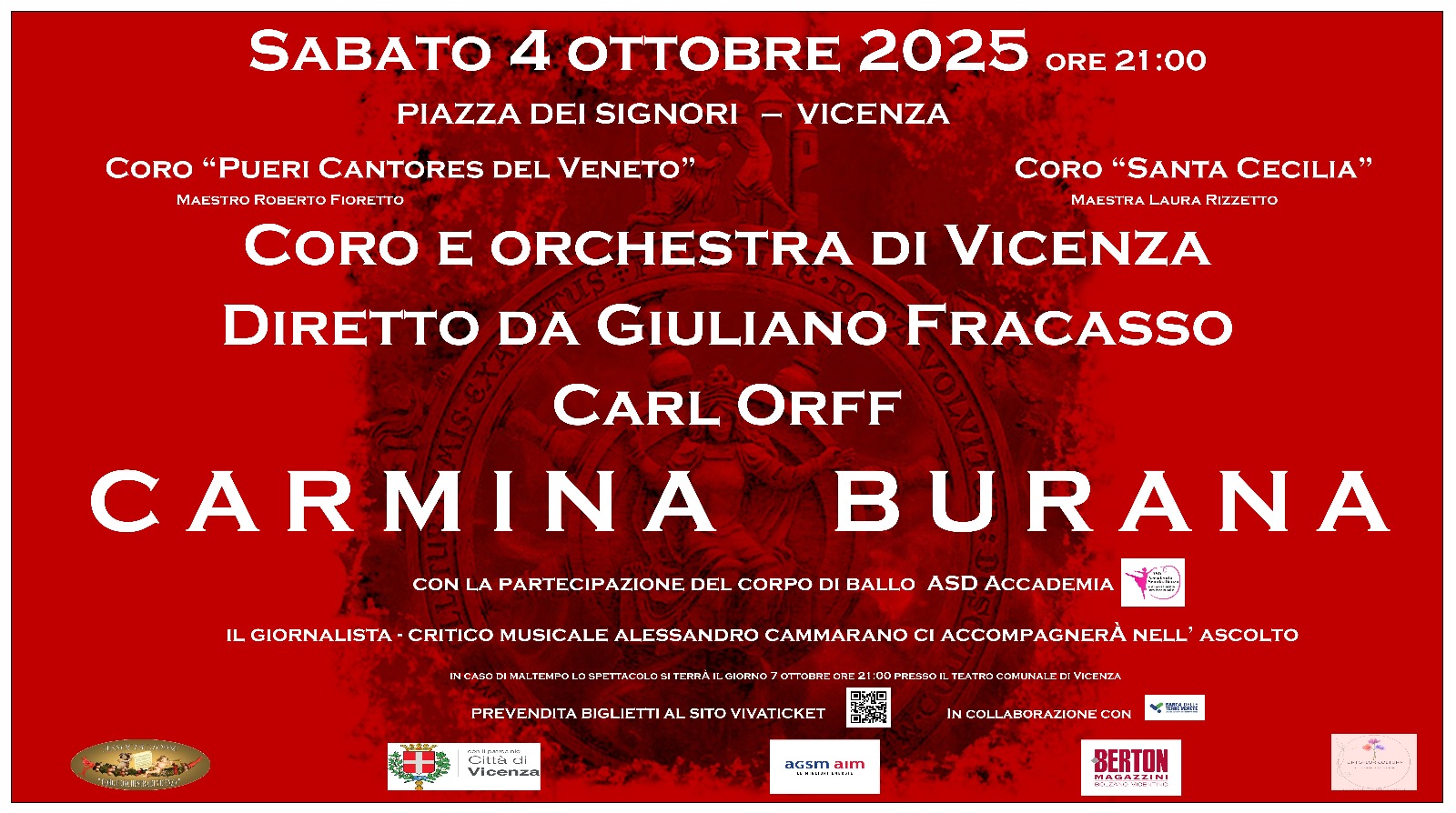 L’Associazione “Coro e Orchestra di Vicenza” APS, ha organizzato per il giorno 4 ottobre 2025, in Piazza dei Signori (Vicenza), l’esecuzione della famosa composizione musicale di Carl Orff : “CARMINA BURANA”L’opera, una cantata scenica composta da Orff tra il 1935 e il 1936, è basata su una serie di componimenti poetici medieovali – ventiquattro in tutto – che furono rinvenuti nel 1803 nel monastero di San Benedetto a Benediktbeuern, in Alta Baviera.